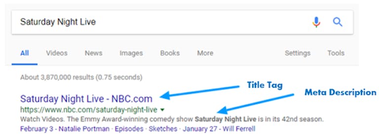- Meta Data: Meta data consists of a Title Tag and Meta Description that are displayed around the URL and gives more information around what you will find on the destination URL, as seen in the image below. Including comprehensive and optimized meta data will allow for all users to have a better understanding of the content of a page. For users searching on Google or other search engines, their screen readers or other assistive devices will easily be able to tell the user the content of a page, limiting the number of clicks they may have to make to get to the content they are looking for.